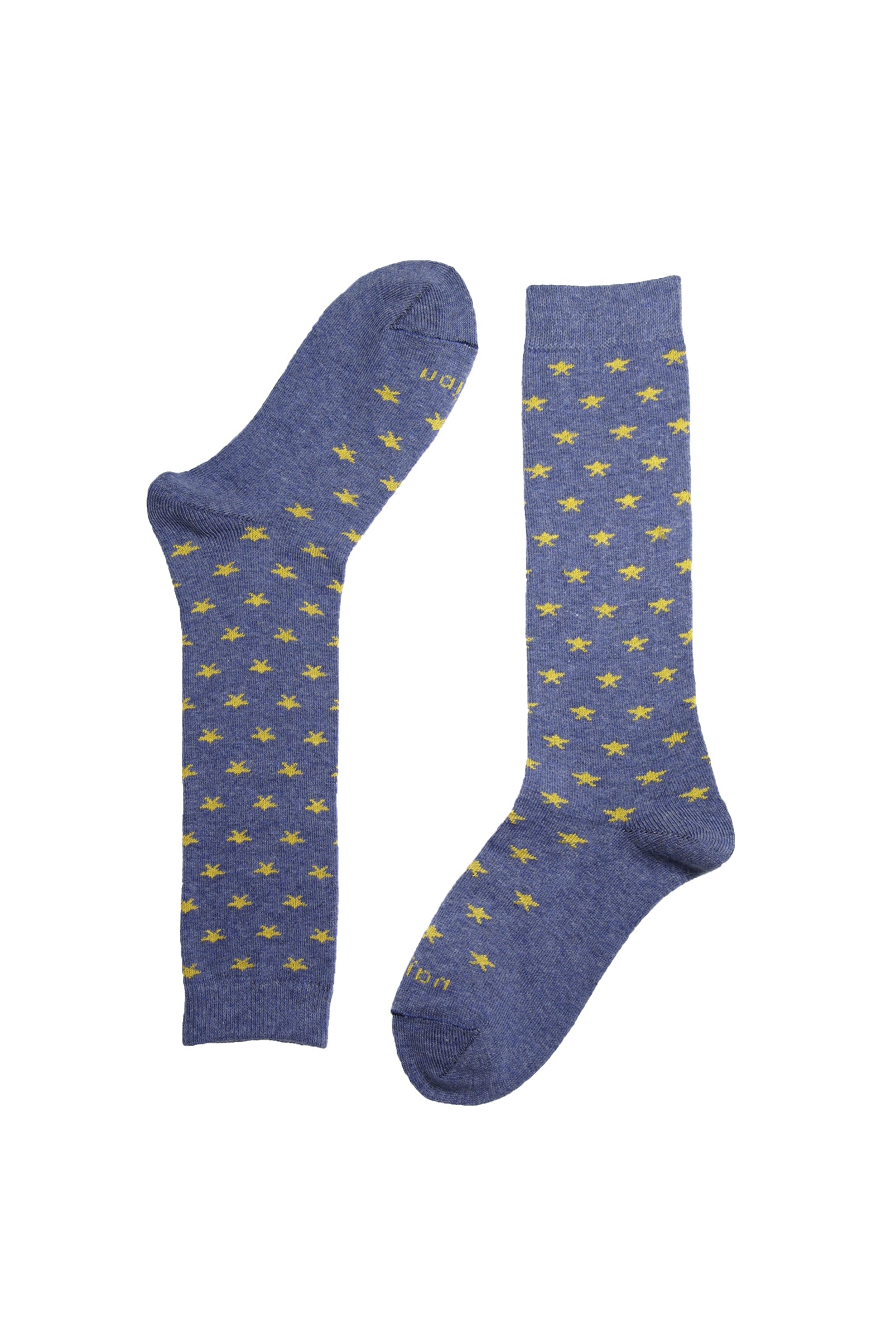 Chaussette longue bleu ciel avec étoiles jaunes. Composition : 90% coton, 8% polyamide, 2% lycra. Habilement tissé en Espagne.