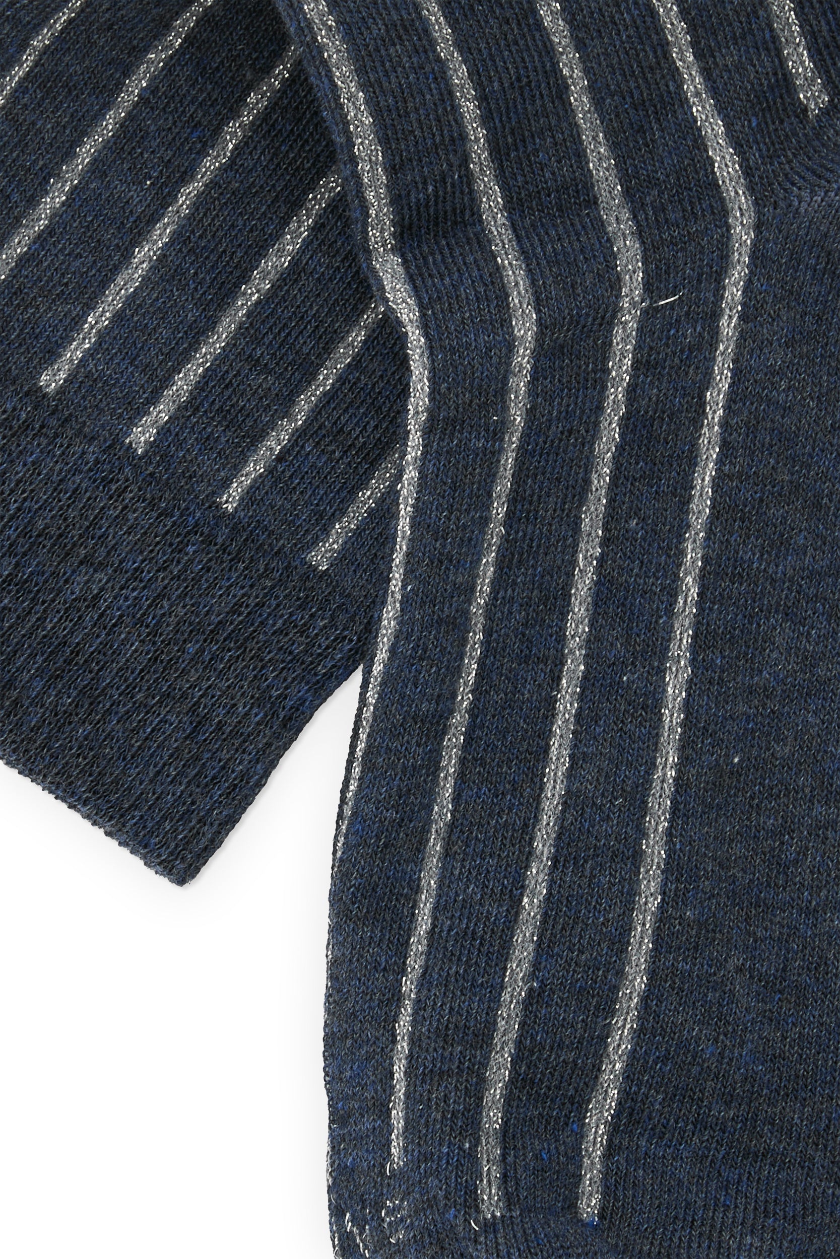 Calcetines con canalé confeccionados con hilo metalizado gris, con el fondo azul índigo.