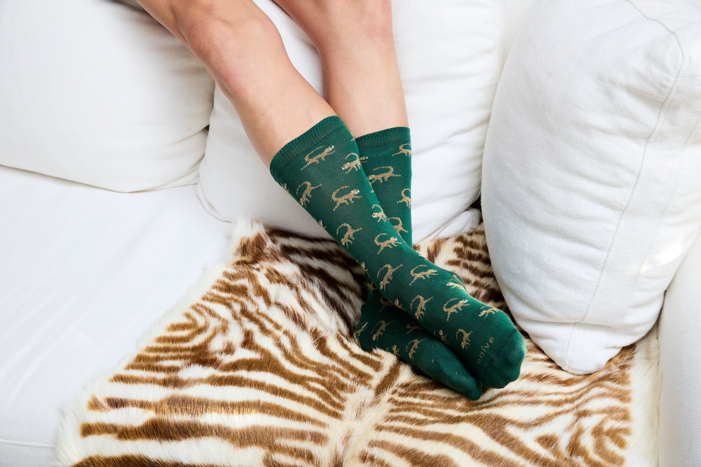 Calcetines con estampado de monos con fondo verde.