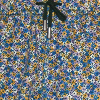 Costume blu, bianco, giallo e lilla con stampa Liberty. Con tasca posteriore con patta e chiusura in velcro e due tasche laterali con rete interna. Tessuto esterno in microfibra e slip interno in rete 100% poliestere.