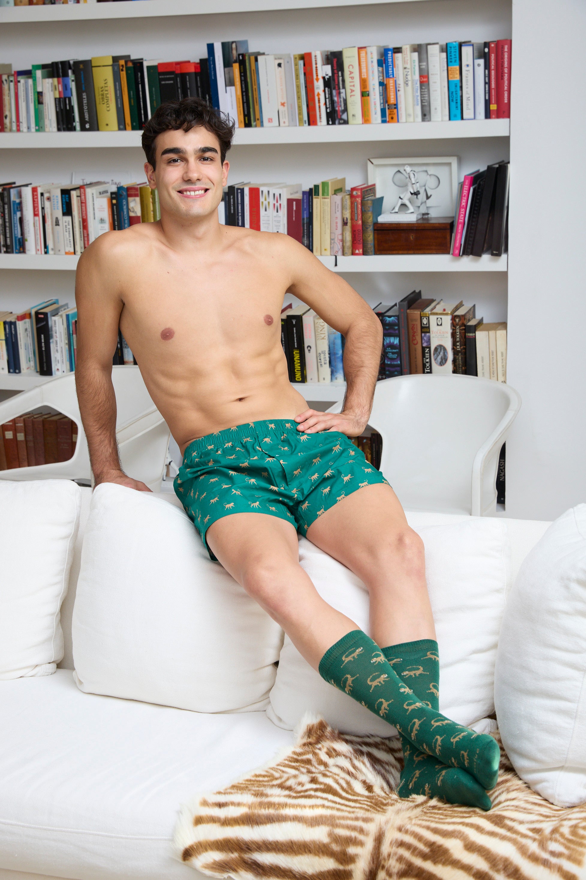 Calzoncillo de tela verde con estampado de mono.