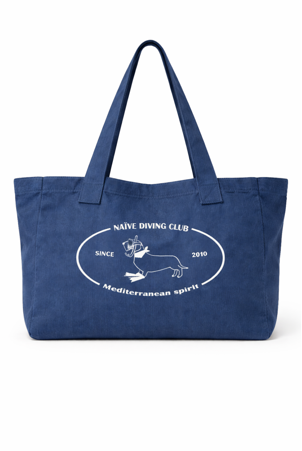 Tote bag de color azul marino con diseño de teckel de buceo.