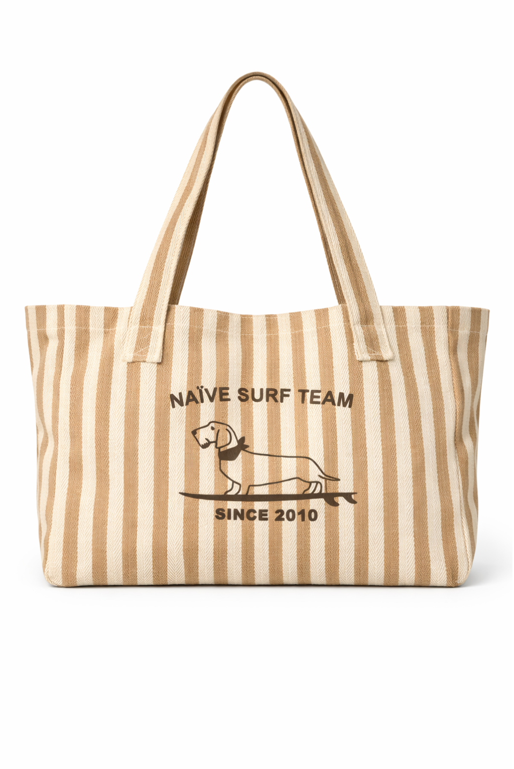 Tote bag de a rayas crema y beige con diseño de teckel de buceo.